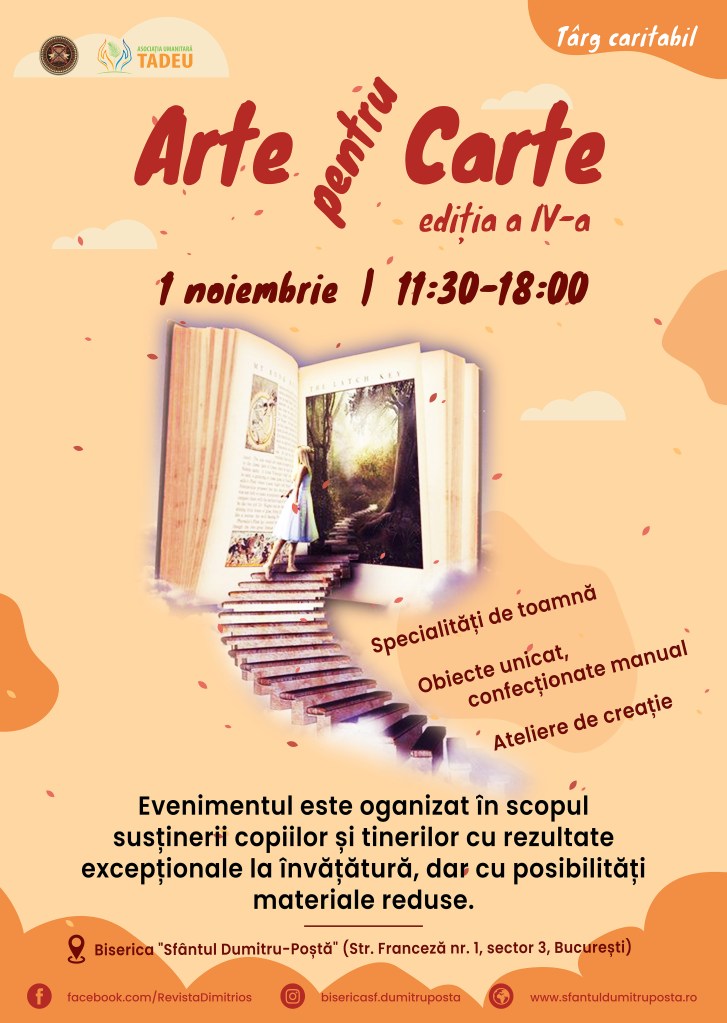 Produsele ce vor putea fi achiziționate la târgul caritabil pot fi vizualizate în această pagină: https://sfantuldumitruposta.ro/arte-pentru-carte-2020/