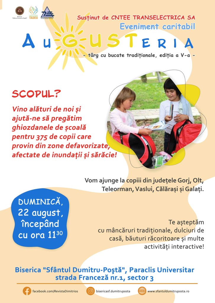 Augusteria – târg caritabil Pe 14/08/2021 De Sf. Dumitru PoştăÎn Uncategorized Partajează asta: Dă clic pentru a partaja pe X(Se deschide într-o fereastră nouă) X Dă clic pentru a partaja pe Facebook(Se deschide într-o fereastră nouă) Facebook Apreciază Încarc... Similare