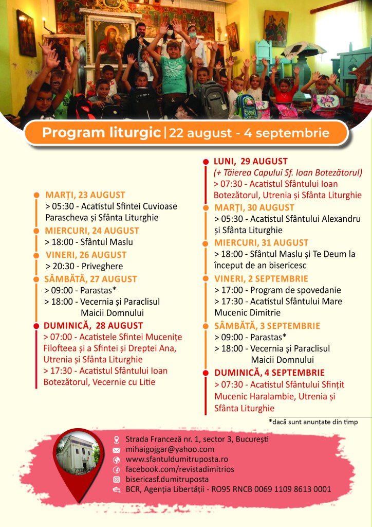 Program liturgic 22 august – 4 septembrie 2022 Pe 27/08/2022 De Sf. Dumitru PoştăÎn Uncategorized Partajează asta: Dă clic pentru a partaja pe X(Se deschide într-o fereastră nouă) X Dă clic pentru a partaja pe Facebook(Se deschide într-o fereastră nouă) Facebook Apreciază Încarc... Similare