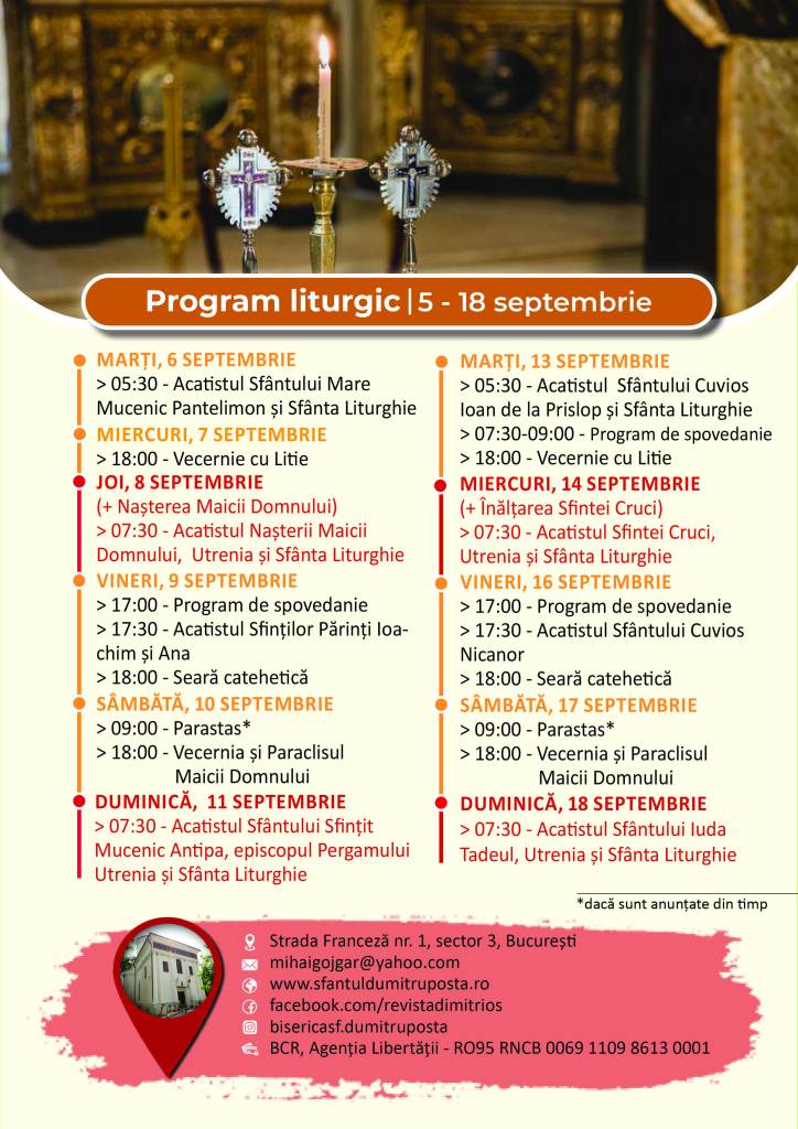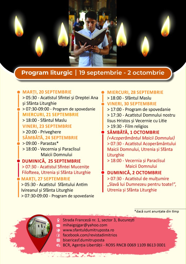 Program liturgic 19 septembrie – 2 octombrie 2022 Pe 18/09/2022 De Sf. Dumitru PoştăÎn UncategorizedLasă un comentariu