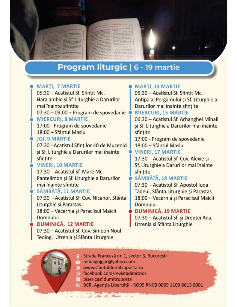 Program liturgic – 6-19 martie 2023 Pe 05/03/2023 De Sf. Dumitru PoştăÎn Uncategorized Partajează asta: Dă clic pentru a partaja pe X(Se deschide într-o fereastră nouă) X Dă clic pentru a partaja pe Facebook(Se deschide într-o fereastră nouă) Facebook Apreciază Încarc... Similare