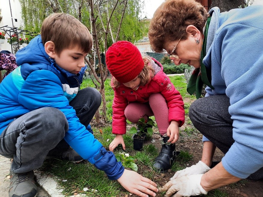 Scopul activității noastre a fost acela de a implica copiii alături de cei vârstnici în activitățile organizate periodic în parohia noastră, iar aceștia să capete deprinderi de mici gospodari. Au venit pregătiți cu lopățică și greble, au adus cu ei răsaduri de flori, câteva semnițe și, îndrumați cu duioșie de către vârstnicii parohiei noastre, au plantat flori în curtea bisericii. Au lucrat ca o echipă, au ascultat îndrumările celor cu mai multă experiență, au exersat răbdarea și grija față de tot ce ne înconjoară. Au descoperit importanța îngrijirii plantelor, că orice lucru făcut cu grijă, cu răbdare, îngrijit pe parcursul timpului, dă roade bune. Și binele sădit în sufletele copiilor chiar de bunici, prin poveștile lor nemuritoare, spuse cu glas cald si blând, își arată roadele în timp.