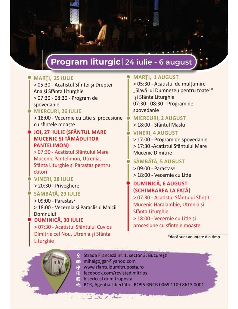 Program liturgic – 24 iulie-6 august Pe 23/07/202321/07/2023 De Sf. Dumitru PoştăÎn Uncategorized Partajează asta: Dă clic pentru a partaja pe X(Se deschide într-o fereastră nouă) X Dă clic pentru a partaja pe Facebook(Se deschide într-o fereastră nouă) Facebook Apreciază Încarc... Similare