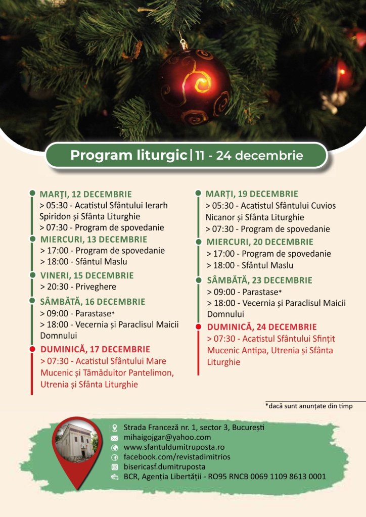 Program liturgic – 11-24 decembrie 2023 Pe 10/12/2023 De Sf. Dumitru PoştăÎn Uncategorized Partajează asta: Dă clic pentru a partaja pe X(Se deschide într-o fereastră nouă) X Dă clic pentru a partaja pe Facebook(Se deschide într-o fereastră nouă) Facebook Apreciază Încarc... Similare