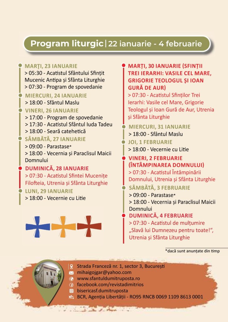 Program liturgic 22 ianuarie – 4 februarie 2024 Pe 21/01/2024 De Sf. Dumitru PoştăÎn Uncategorized Partajează asta: Dă clic pentru a partaja pe X(Se deschide într-o fereastră nouă) X Dă clic pentru a partaja pe Facebook(Se deschide într-o fereastră nouă) Facebook Apreciază Încarc... Similare