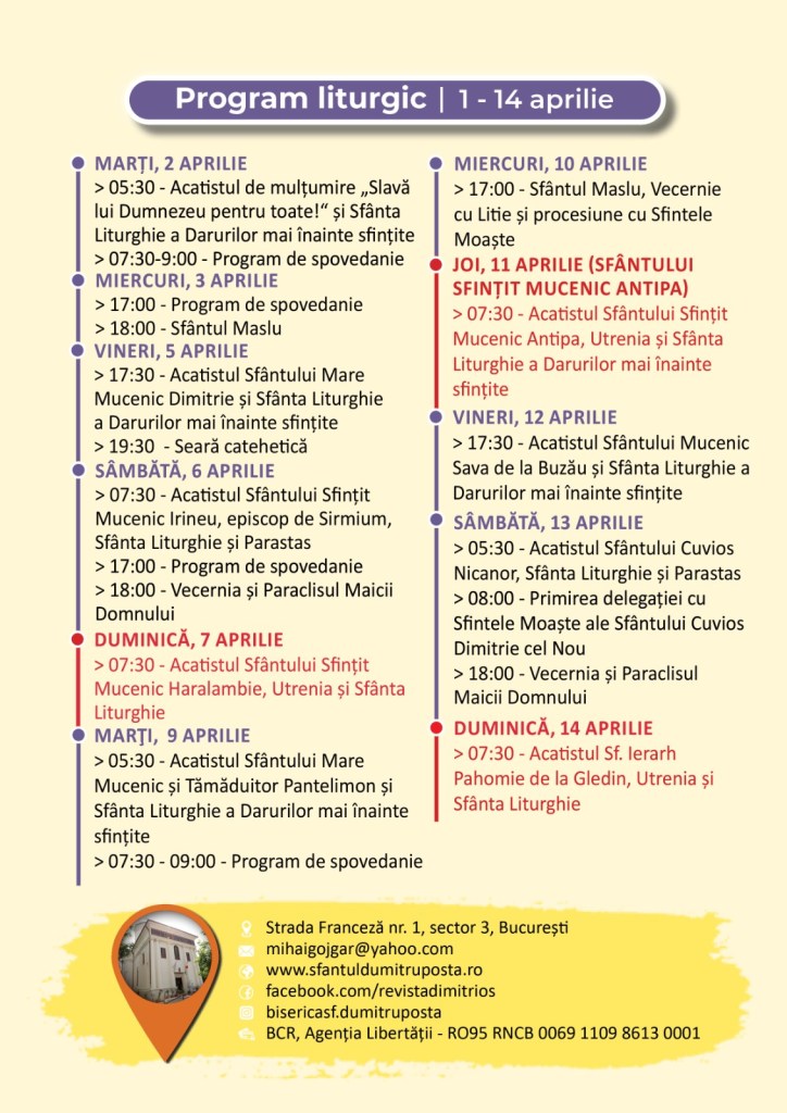 Program liturgic – 1-14 aprilie 2024 Pe 31/03/202403/04/2024 De Sf. Dumitru PoştăÎn Uncategorized Partajează asta: Dă clic pentru a partaja pe X(Se deschide într-o fereastră nouă) X Dă clic pentru a partaja pe Facebook(Se deschide într-o fereastră nouă) Facebook Apreciază Încarc... Similare