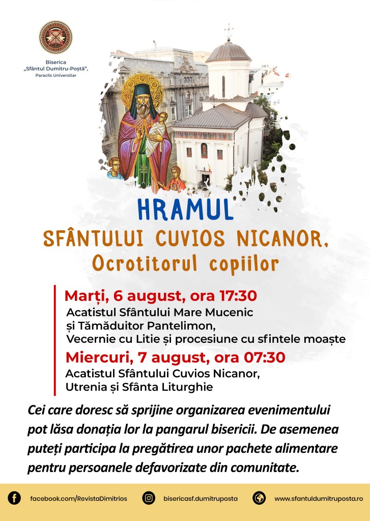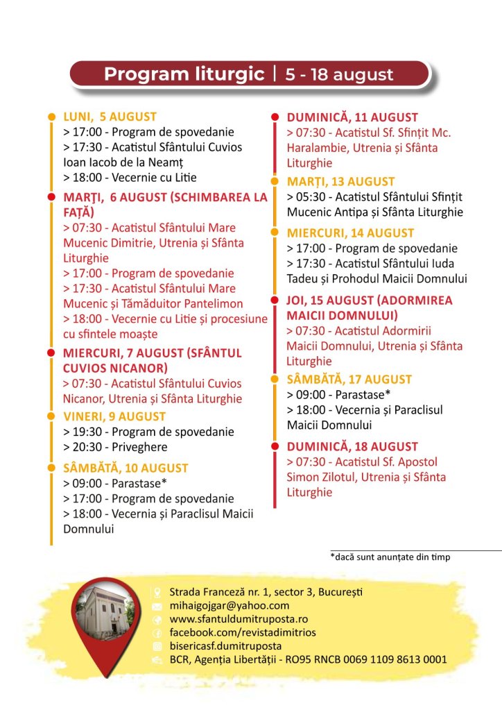 Program liturgic – 5-18 august 2024 Pe 04/08/2024 De Sf. Dumitru PoştăÎn UncategorizedLasă un comentariu