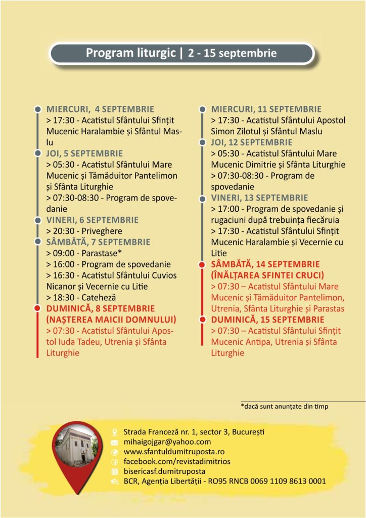 Program liturgic- 2-15 septembrie 2024 Pe 01/09/202430/08/2024 De Sf. Dumitru PoştăÎn UncategorizedLasă un comentariu