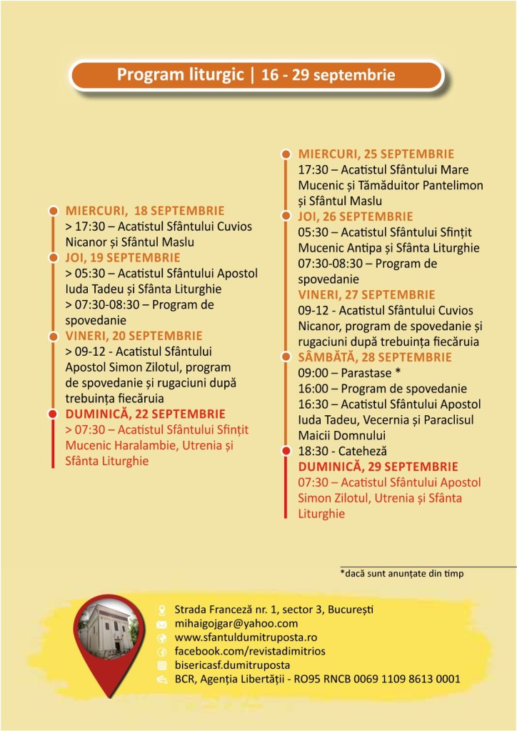 Program liturgic – 16-29 septembrie 2024 Pe 15/09/2024 De Sf. Dumitru PoştăÎn UncategorizedLasă un comentariu